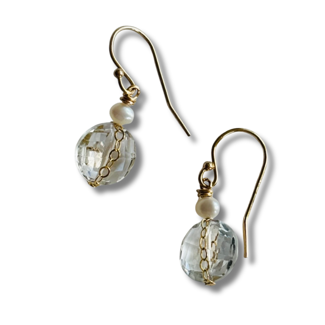 Chic pick-me-up earrings or a set. (Pair with gem dot necklace) Choose hand cut White topaz with white pearls or Smoky topaz with gold pearls. Chain wrapping in 14k gold filled.