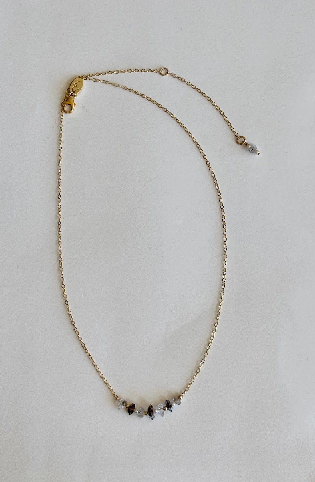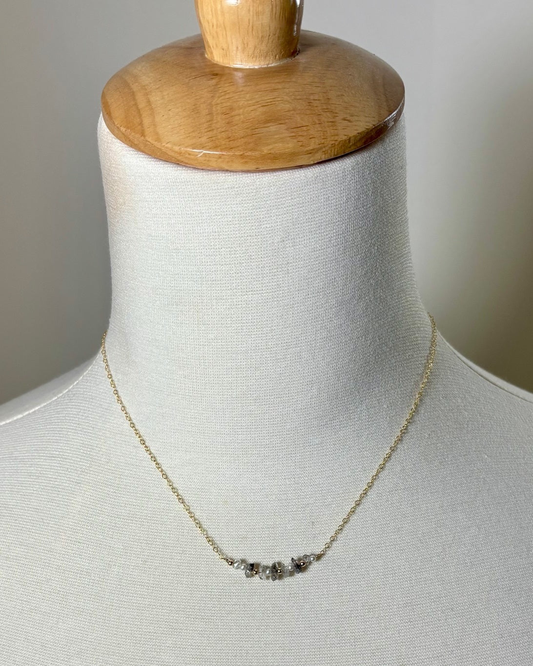 The Castleknock mini mixes rutilated quartz, pearls and 14kgf beads. Layered or alone it highlights your collarbone and is a perfect piece for everyday wear. Pair with the Palace Earrings to take to a different level. Black and is trending now so this piece is perfect.