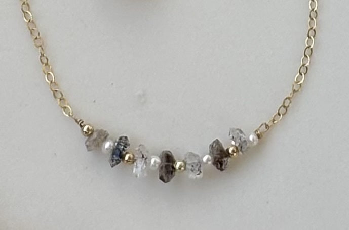 Deb incorporates pearls for her days of classic black and special occasions, semi precious stones such as labradorite and  tourmaline, for her bohemian looks.