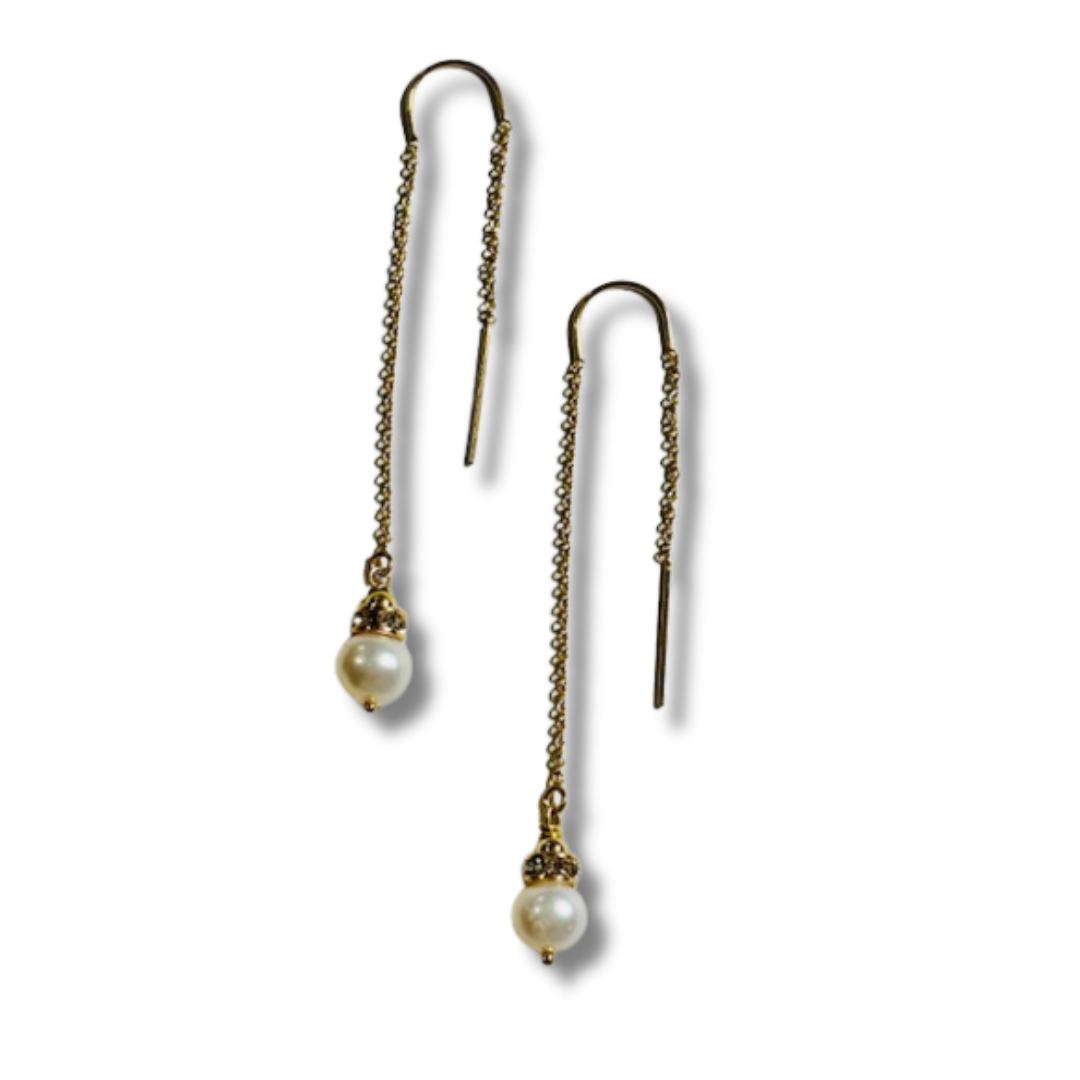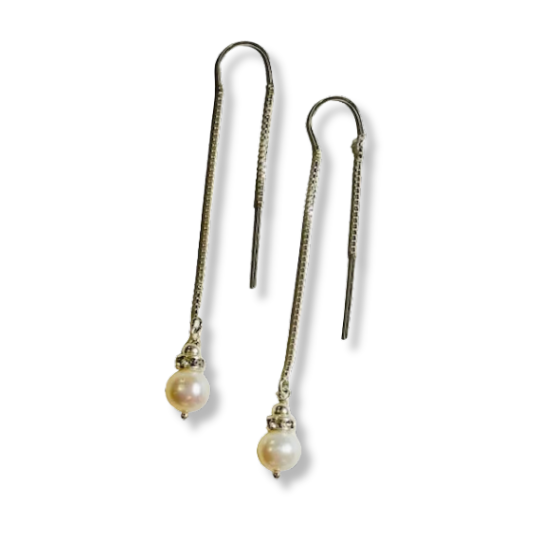 Be allured by the Maeve pearl threaders. Classic pearls and Swarovski Crystal rondelles are suspended on box chain threaders. Add an edge to classic.