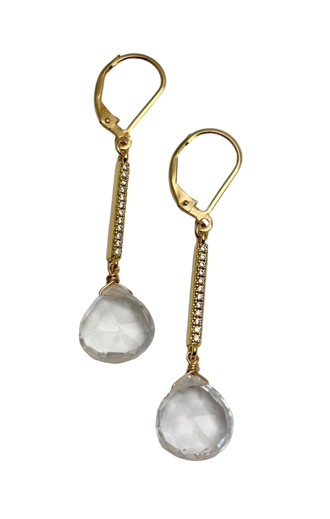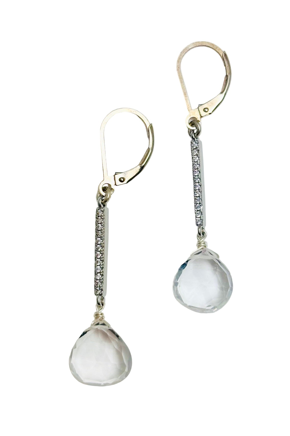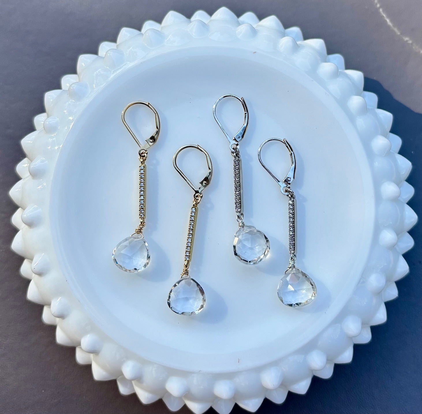 Hand cut white topaz shine and the pave bars sparkle. A stellar holiday choice for the holidays. Choose 14k gold filled or sterling.